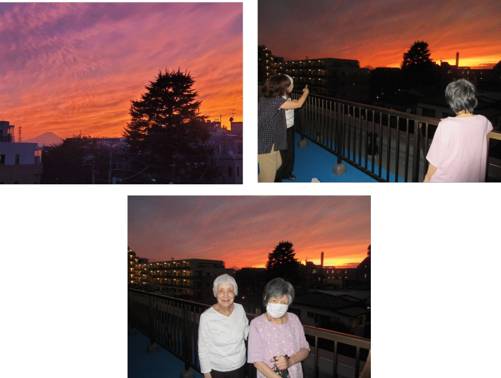 Kemarin sore, karena matahari terbenam dan Gunung Fuji terlihat sangat indah dari atap Ajisai-en, kami pergi bersama para pengguna layanan untuk melihatnya.